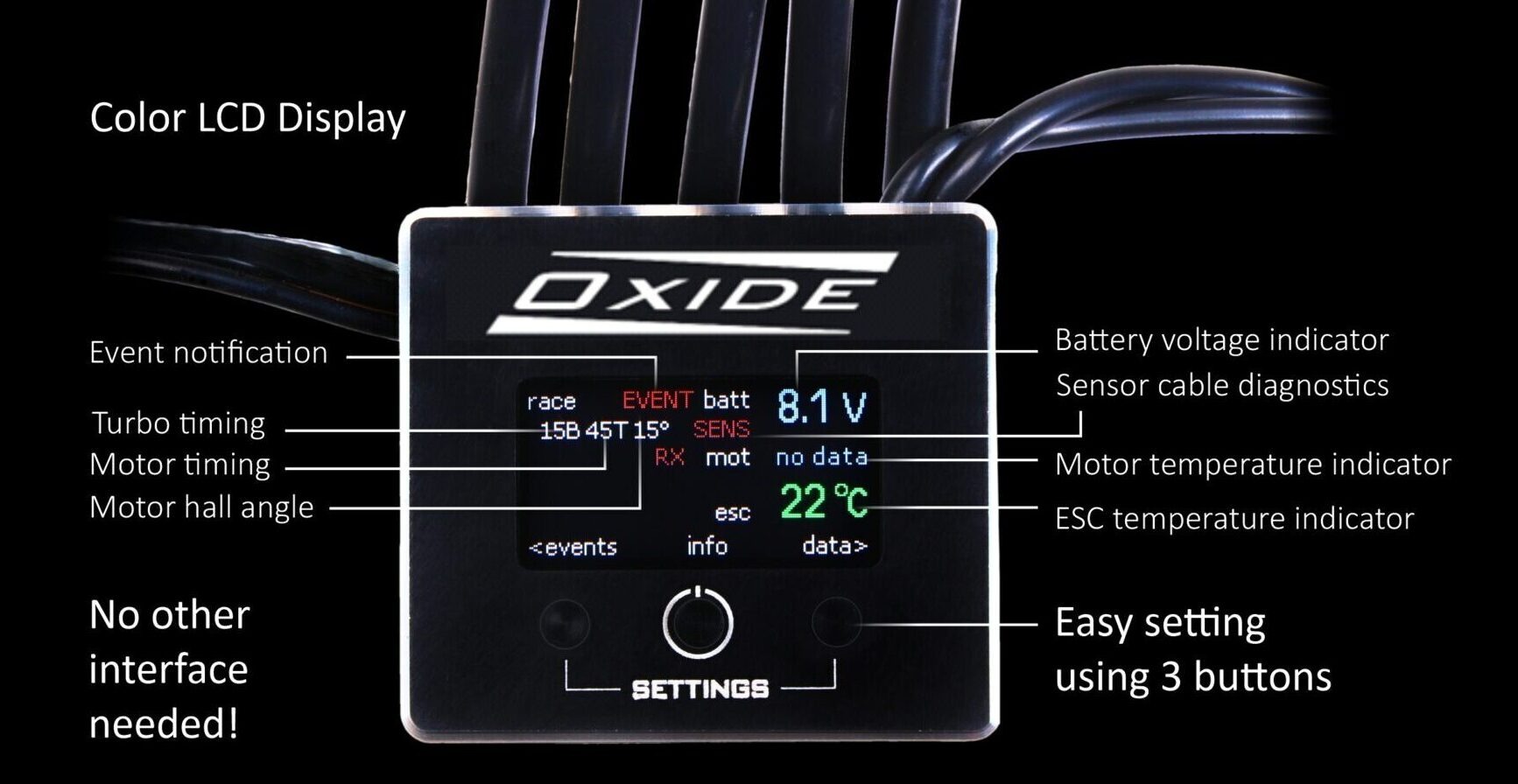 Elceram Oxide ESC on mõeldud eelkõige Stock klassides kasutamiseks. Elceram ESC uue TFT-LCD ekraanilt saad lugeda otse mudelilt kõiki parameetreid, lisaks saad ka neid muuta otse ESC pealt. Ka Elceram Oxide kiiruse regulaator on varustatud uue jahutustehnoloogiaga.