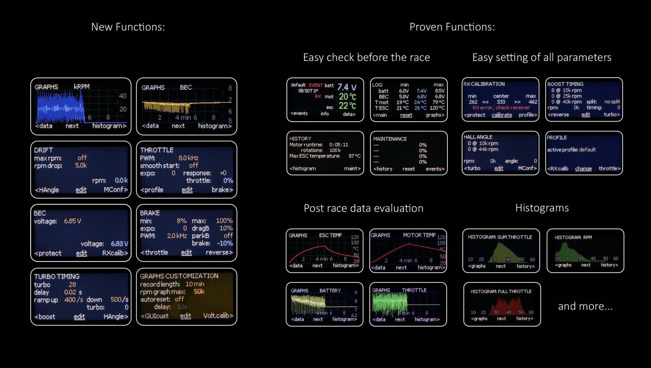 - Järjepidev BEC ja mootori pinge jälgimine – ohutus ja stabiilsus võistlusolukorras.