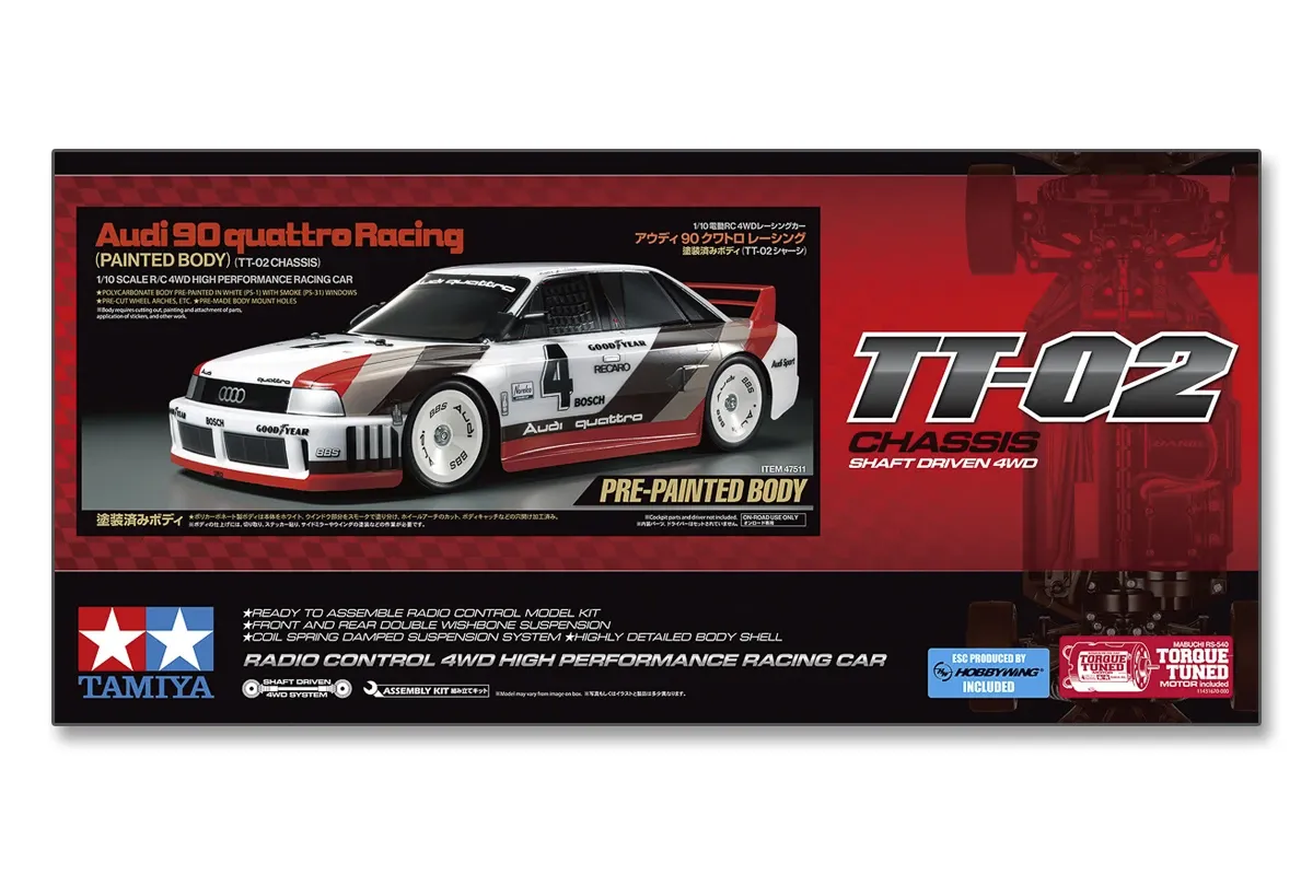 The Tamiya Audi 90 quattro Racing (TT-02) brings the legendary 1989 race car to life as a detailed 1/10 scale R/C model. This limited version includes a pre-painted white body with smoked windows, making assembly quick and easy. Built on the TT-02 4WD chassis, it offers excellent stability, handling, and driving performance—perfect for both beginners and experienced hobbyists.