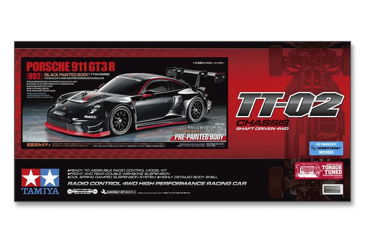 The Tamiya Porsche 911 GT3 R (992) (TT-02) is an impressive 1/10 scale R/C model that faithfully recreates this legendary GT3 race car. This limited version includes a pre-painted body (black/gun metal with smoked windows), making assembly quick and easy. Built on the TT-02 4WD chassis, it offers excellent stability, handling, and driving performance—perfect for both beginners and experienced hobbyists.