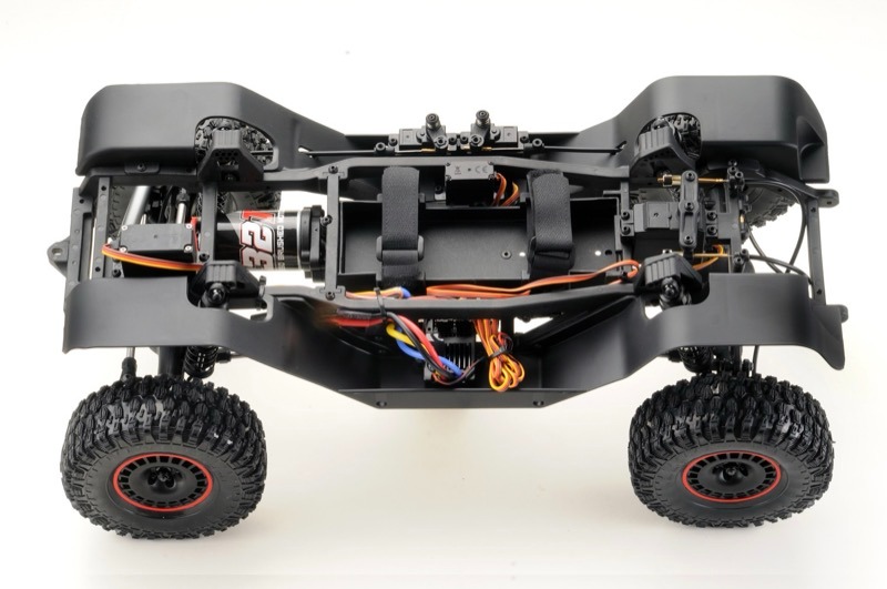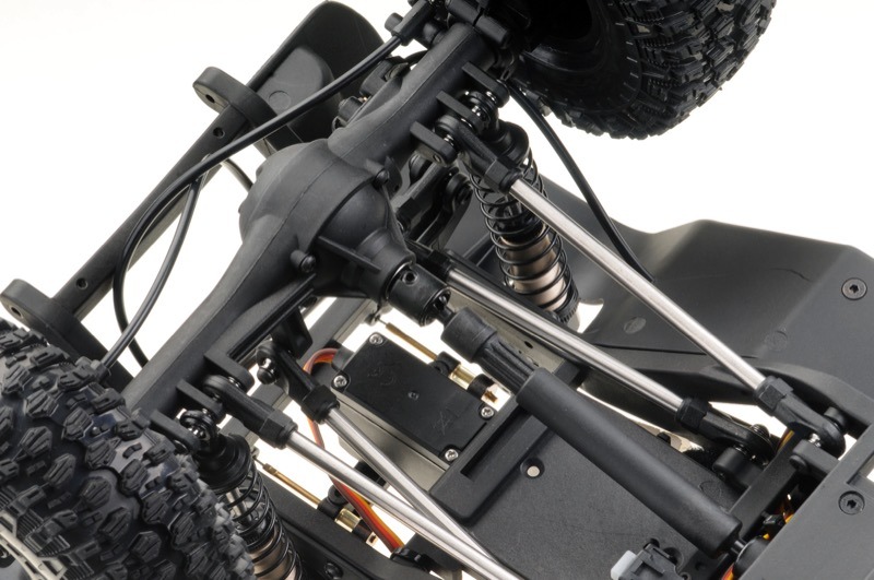 The completely redesigned tubular chassis offers many advantages! All electronic components are easily accessible, which is crucial considering the amount of technology packed into the device! Thanks to the extremely low "LCG" chassis and the matching gearbox, the center of gravity is lower, which is especially useful for high-body concepts like our WOLF. The battery box is located in the middle and can be perfectly adapted to all 2-3S LiPo and 6-7-cell NiMH batteries thanks to the Velcro fastener and adjustable holder. An 11-channel remote control is required to control all technical functions. The 3-in-1 ESC/receiver and lighting unit are kept separate to offer the pilot all the options for future optimization/tuning.